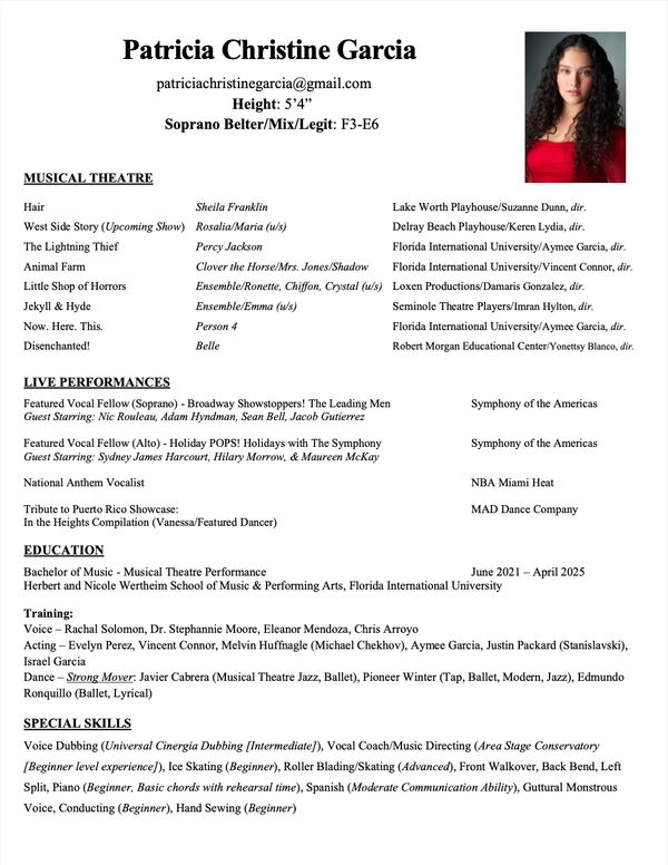 Patricia Christine Garcia (she/her) is a passionate and driven soprano with a powerhouse voice. A proud Cuban-American artist, she recently won first place in the NATS Gold Coast Upper Musical Theatre Category. Patricia made her professional debut with Loxen Entertainment’s Little Shop of Horrors, serving as an ensemble member and swing for Crystal, Ronette, and Chiffon. She is also active in voice dubbing at Universal Cinergia Dubbing, in rehearsals to play Rosalia and Maria's understudy in West Side Story, and is currently performing as Sheila Franklin in the musical Hair at Lake Worth Playhouse.